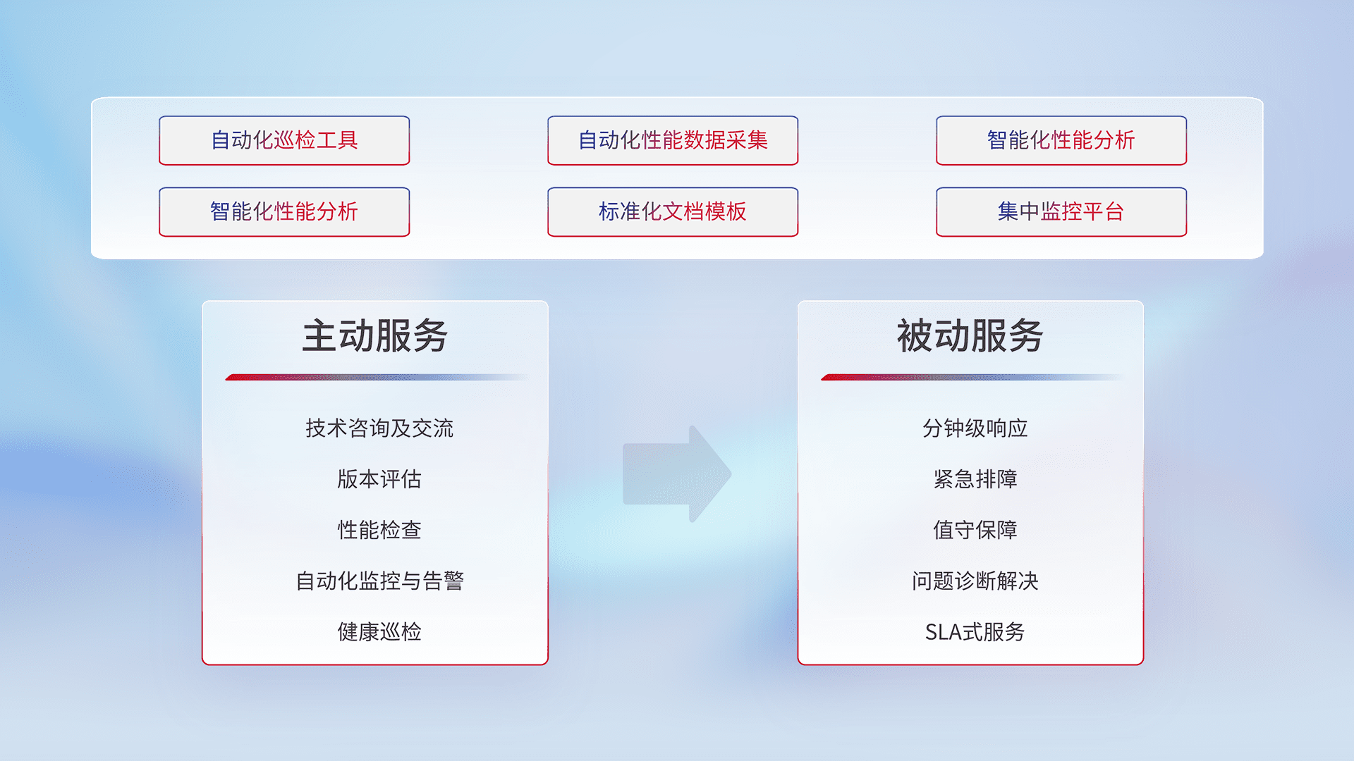 智能化工具和标准化文档,,,,保障服务质量,,,提供主动服务(包含技术咨询、、版本评估、、、性能检查、、、、自动化监控与告警、、、、健康巡检)和被动服务包含(分钟级响应、、、、紧急排障、、、值守保障、、、问题诊断解决、、、SLA服务)。。。